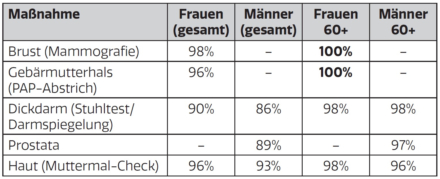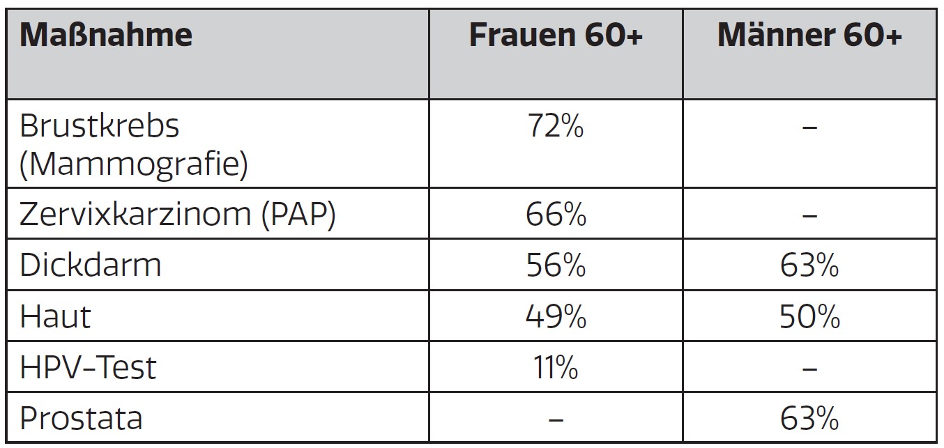 Tab. 2: Zumindest einmalige Nutzung einer Früherkennungsuntersuchung (nach Geschlecht und Maßnahme, Altersgruppe 60+)
